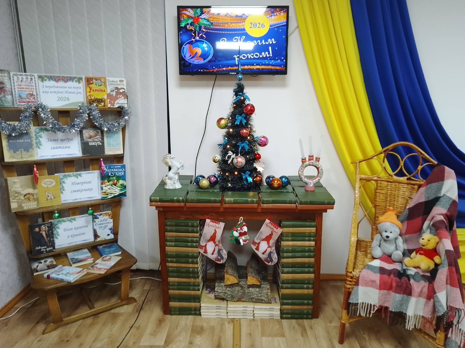 Новий рік - одне з найпопулярніших календарних свят. Цей день протягом століть щорічно відзначають, люблять, чекають дорослі і діти. Святкова книжкова виставка-інсталяція «З передзвоном на поріг настає Новий рік» представляє книги про зимові звичаї, традиції, колядки, які передаються з покоління в покоління. Новорічні вітання підготували користувачі бібліотеки.