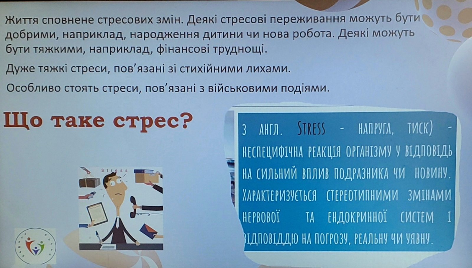 Обговорили, що таке стрес, йото види, можливі наслідки та дієві шляхи подолання. Зустріч пройшла активно у форматі відкритого діалогу. Дякую всім за щирість, небайдужість і готовність піклуватися про своє ментальне здоров'я.